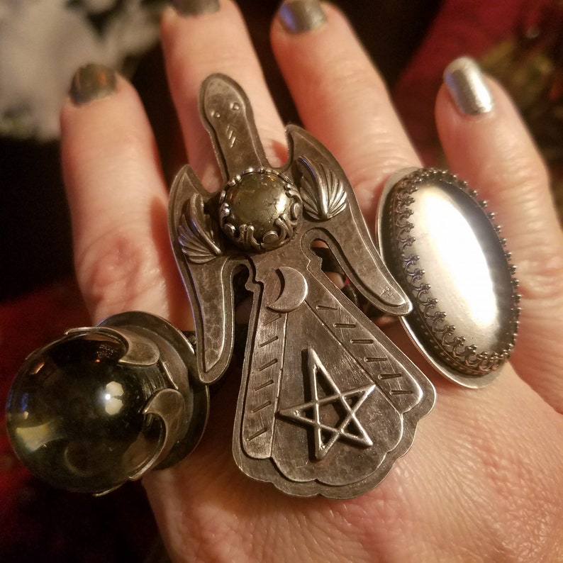 This is a solid sterling silver handmade ring with a genuine natural round Pyrite cabochon.It is my original take on the Native American Thunderbird. I have combined the essence of the Thunderbird with features of Baphomet. The top portion of the bird has wings like Baphomet and the tail is similar to that of the Thunderbird.There is a crescent moon and Pentagram detail on this piece.My Maker's Mark 'ASA' is on the back of the ring. It is also stamped "Sterling".The ring measures 2 5/8 inches long and 1 1/8 inch wide.It is quite a statement piece! You will feel the magic when you wear this ring! I'm very proud of this piece and I'm thrilled to be able to offer it for sale.*Other rings in photo are sold separately*This listing is for a special order for this jewelry design. The piece in the photos is the design you will receive, specially made following your purchase. It is completely handmade so please note that I will need time to complete this. I will email you once the order is placed to give an approximate completion date.